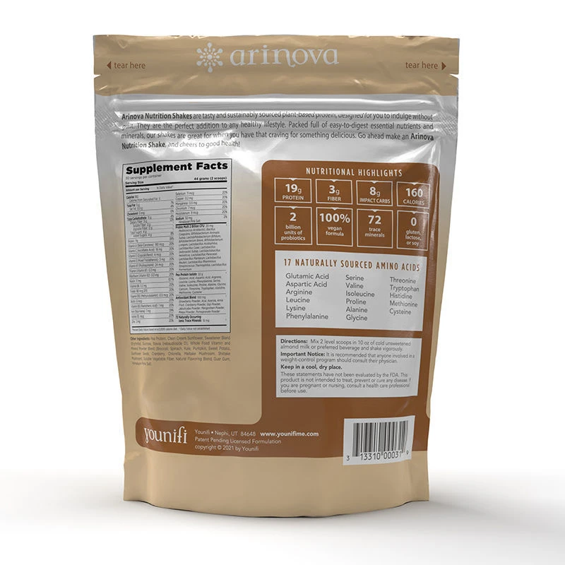 Arinova nutritional shake that provides 21 vitamins and minerals, protein, a trace mineral, probiotics, and antioxidants to give you an added boost of nutrition to support your dietary and wellness goals. The creamy chocolate flavor of Arinova provides a rich and broad milk chocolate taste with a hint of hazelnut, dark chocolate, and just a touch of caramel.