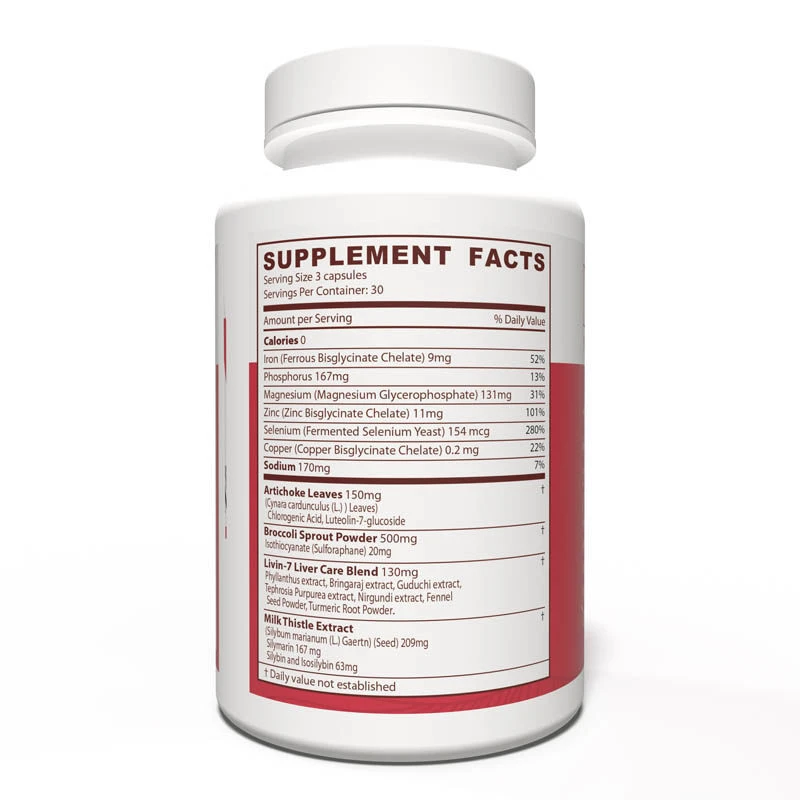 Vivia provides essential nutrients to support proper liver function. The star ingredient in Vivia is a standardized extract from broccoli spouts high in sulforaphane. A significant plant nutriceutical that increases the liver’s natural detoxification enzymes and protects it from damage. It also includes artichoke extract, high in chlorogenic acid, a protective agent to the liver through its antioxidant and anti-inflammatory activity. At the same time, the secondary ingredients of selenium yeast, zinc, iron, copper, and magnesium are all essential to the liver. They support liver detox enzymes such as glutathione, catalase, and superoxide dismutase. Â