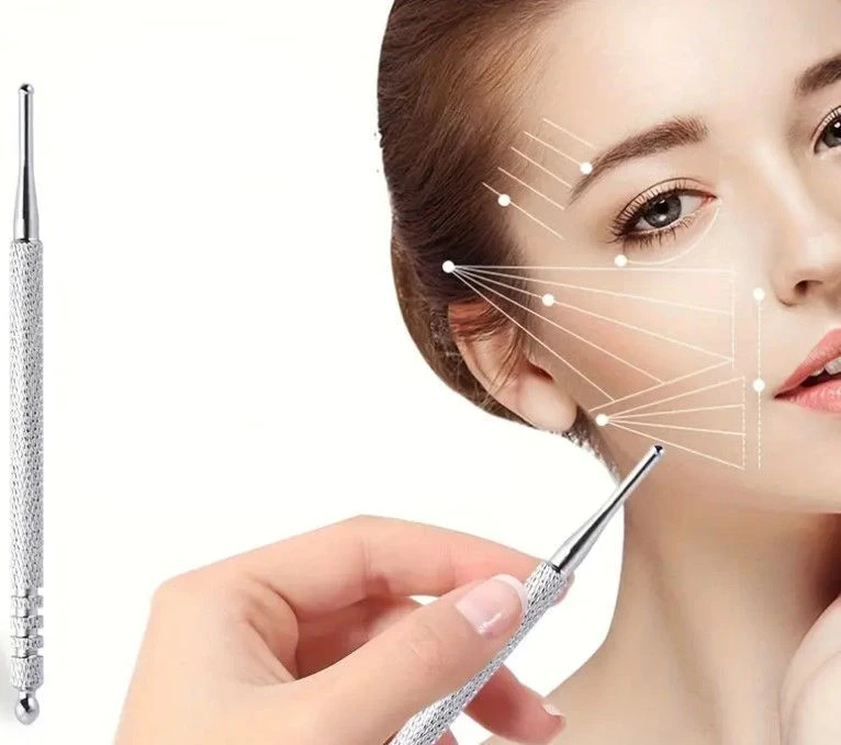 A tool used for acupressure massage, where the user applies pressure to specific points on the body (acupoints) using a small, metal tip, with the “dual head” feature allowing for different sized pressure points to be targeted depending on the area being massaged